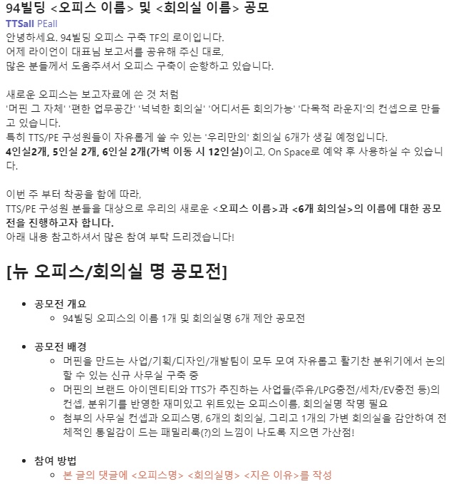 누군가 어디서 근무하냐고 물었을 때 "94빌딩에서 근무한다."라는 시시한(?) 대답을 피하기 위해, 우리만의 이름을 짓기로 했어요. 그래서 인테리어 컨셉이 어느 정도 정해지고 나서는 <업무 공간 및 회의실 네이밍 공모전>을 개최했답니다. 뚜-둔! ✨