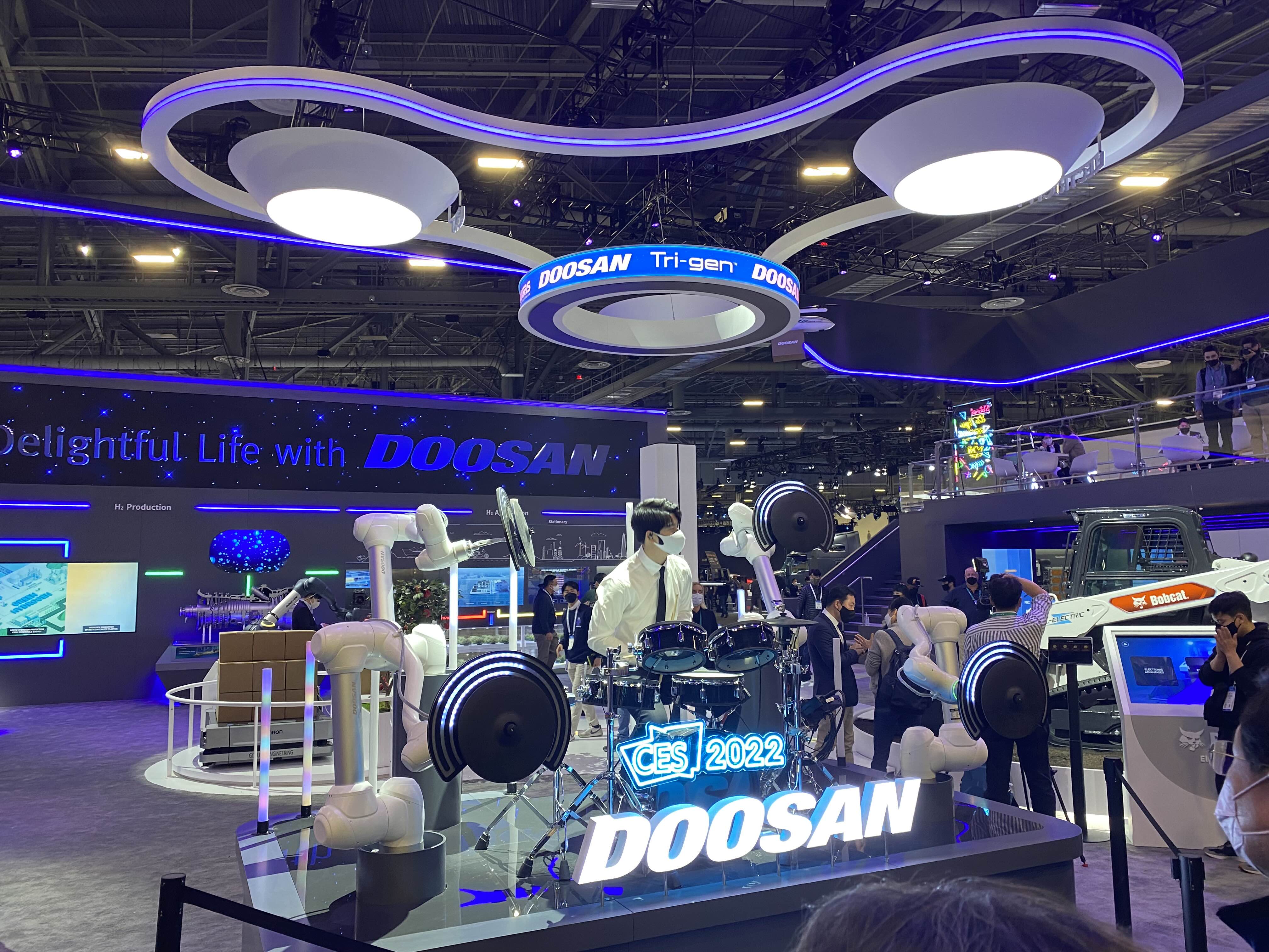 현대자동차가 로봇 개를 선보였다면 두산은 로봇 드럼을 선보였습니다. 신나는 음악에 맞추어 움직이는 로봇 팔이 드럼으로 변신했어요! 1시간에 한 번 펼쳐진 드럼 연주쇼도 인기가 아주 높았다죠? 🎪 이외에도 다양한 산업용 로봇을 선보이며, 두산이 꿈꾸는 미래를 세계인들에게 알렸습니다.